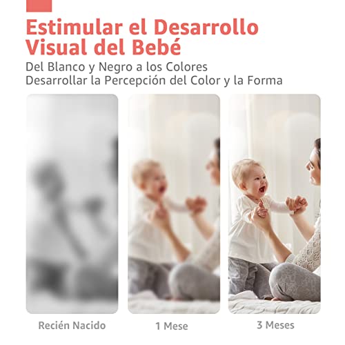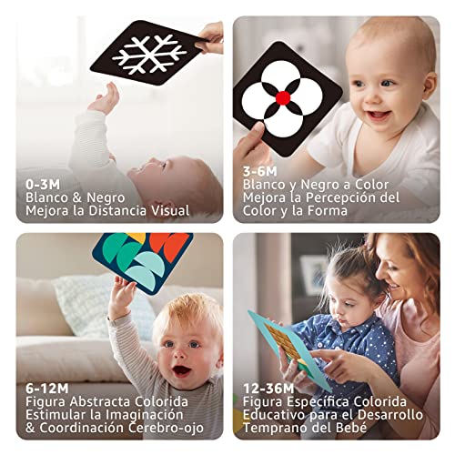 • 【Desarrollo Visual】El uso de tarjetas de alto contraste para bebés, junto con tarjetas con imágenes en blanco y negro, le dará a su recién nacido la oportunidad de aumentar su desarrollo visual. Especialmente diseñado para bebes 0-3 3-6 6-12 12-36 meses.