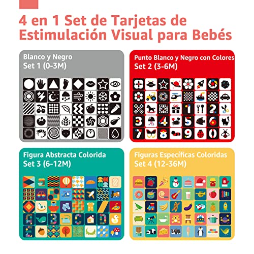 • 【4 Diferente Sets】Set 1 (0-3 Meses): cartas de patrones u objetos en blanco y negro con un alto contraste. Set 2 (3-6 Meses): cartas blancas y negras que incluyen otros colores basicos. Set 3 (6-12 Meses): cartas con piezas abstractas de varios colores. Set 4 (12-36 Meses): cartas de objetos concretos de varios colores.