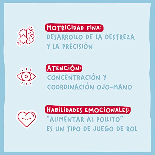 - Desarrollo de habilidades motoras: Pensado para estimular el desarrollo cognitivo en bebés y niños de 2 a 4 años este juego desarrolla las habilidades motrices finas, el reconocimiento del color y la coordinación óculo-manual mientras aprenden a reconocer los colores y a contar. El proceso de encontrar los insectos, atraerlos y alimentar el polluelo es una tarea de complejidad ideal en niños de edad preescolar que requiere de concentración y coordinación para completarla.