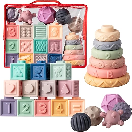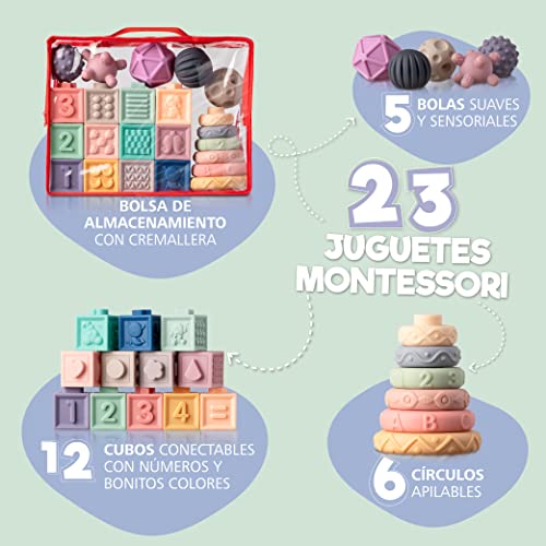 - 23 JUGUETES NIÑOS 1 AÑOS EDUCATIVOS MONTESSORI – Nuestro kit de juguetes bebe contiene 23 juguetes Montessori bebes 6-12 meses perfectos para peques de más de 6 meses y se presentan bajo la forma de un práctico conjunto de 23 piezas individuales, con 12 cubos conectables con números y bonitos colores, 6 círculos apilables flexibles con formas y 5 pelotas suaves y sensoriales perfectas para la dentadura del bebé, ¡un lote perfecto para incontables horas de diversión!
