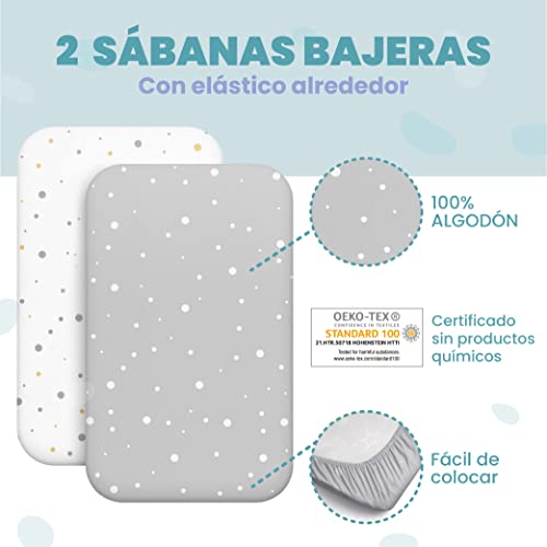 - EL KIT COMPLETO PARA MINICUNA COLECHO, LOTE DE 3 – Ten siempre a mano un sabana de recambio, podrás alternar entre los dos bonitos diseños de las sabanas moises para cubrir el colchón de la minicuna bebe y coloca el cubrecolchón 50×83 directamente sobre el colchon minicuna o cama nido, tu colchón quedará así protegido de manchas y pérdidas y tú y tu bebé podréis dormir serenamente