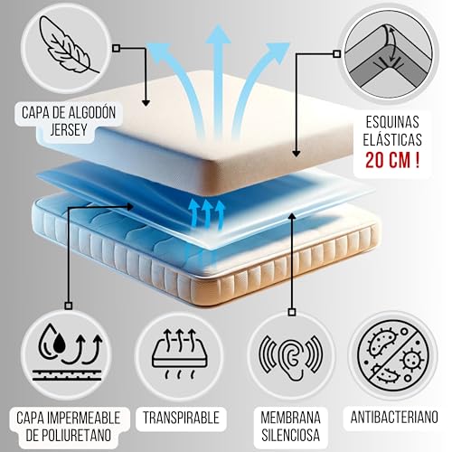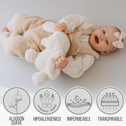 - 💦 IMPERMEABLE. Debajo de la capa de jersey, hay una membrana impermeable de poliuretano. Gracias a este invento podemos proteger la delicada piel de los bebés de las irritaciones, y al mismo tiempo despreocuparse por el colchón. Posibilidad de lavado a 60º en lavadora ayuda en desinfección adecuada, previniendo del crecimiento de las bacterias y ácaros.