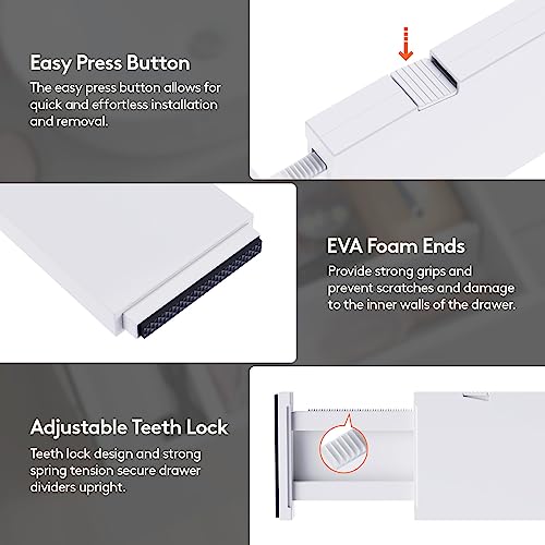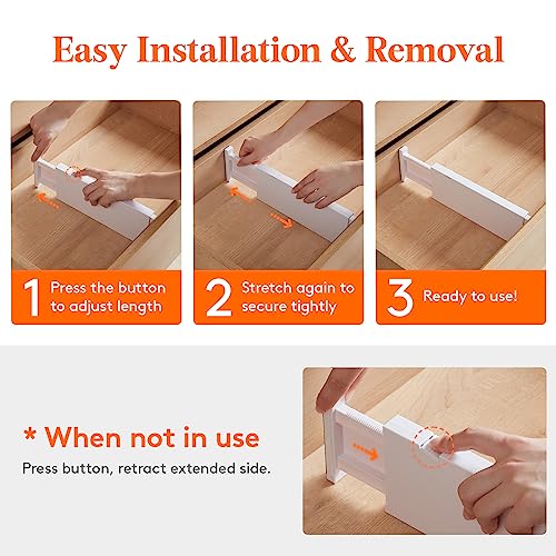 - Fácil instalación y extracción: Presiona el botón superior para ajustar la longitud antes de colocarlo y estíralo nuevamente para asegurarlo firmemente antes de bloquearlo. La fuerte tensión del resorte mantiene cada organizador de cajón en posición vertical de forma segura. Para retraerlo, presiona el botón superior y empuja el lado estirado.