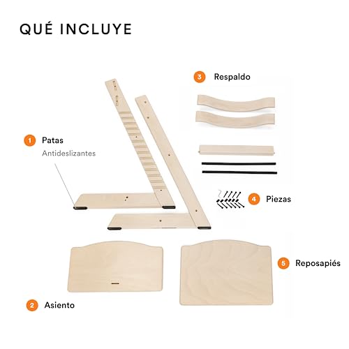 - ATEMPORAL y AJUSTABLE – Con un asiento y reposapiés ajustables, Tripp Trapp permite la libertad de movimiento. Además, está disponible en una amplia gama de colores y dos acabados de madera, para dar un aspecto ideal a cualquier ambiente.