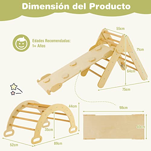 - 【Rampa de Escalada y Arco 2 en 1】Con un diseño de doble cara, la rampa permite a los niños deslizarse o escalar como deseen. Al combinar la rampa con el triángulo de escalada, puede ofrecer diferentes opciones de altura para sus hijos. Además, puedes transformar el arco de escalada en un balancín dándole la vuelta.
